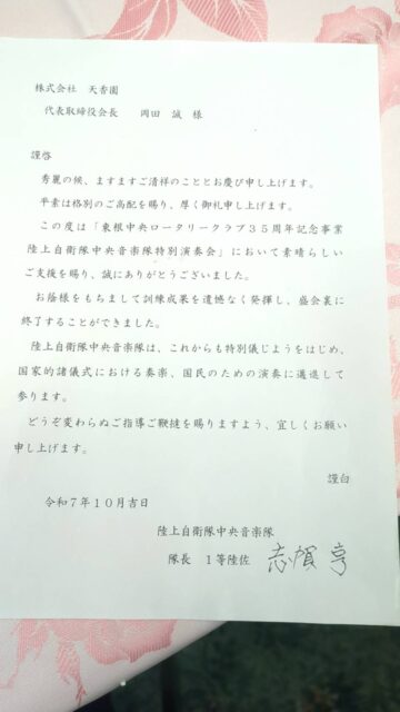 また、岡田SAAより、今回の記念事業に対して各関係団体より大変好評であったとの声が多数寄せられたことと、今回招いた陸上自衛隊中央音楽隊の隊長より感謝のお手紙があったことも紹介されました。